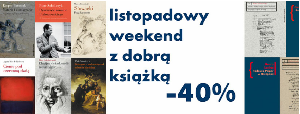 U nas długi listopadowy weekend to czas na ciekawą lekturę i szansa na udane zakupy książkowe. Tylko przez 3 dni, wszystkie książki z naszych dwóch serii: WOKÓŁ LITERATURY oraz WIEK XIX kupisz w promocyjnej cenie z rabatem -40%.