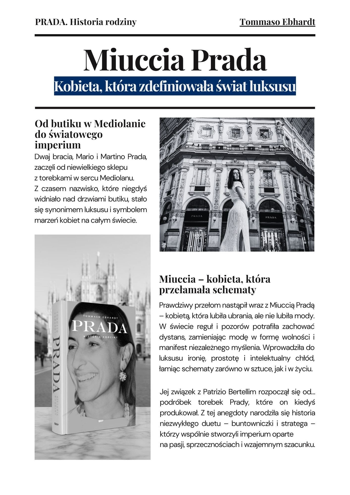 Niepozorny sklepik z torebkami w sercu Mediolanu. Dwaj bracia – Mario i Martino Prada. A potem… światowa potęga modowa, której nazwa elektryzuje wybiegi, galerie i ulice wielkich miast. W centrum tej opowieści stoi jednak nie kto inny, jak Miuccia Prada – projektantka, intelektualistka, strateg. Dla młodej i zbuntowanej Miucci przejęcie rodzinnego biznesu oznaczało koniec młodości. W świecie ubrań i torebek czuła się obco, a do luksusu podchodziła niemal ze wstydem. A mimo to przekształciła rodzinny interes w globalne imperium.
