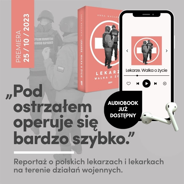 Anna Wacławik dziennikarka radiowa, laureatka dwóch nagród Grand Press w kategorii „Wywiad”, towarzyszy polskim medykom w wyjazdach "na front" ukraiński. W swojej nowej książce jako bezpośredni świadek przedstawia historie polskich lekarzy ryzykujących życie by ratować ofiary zbrojnych konfliktów. To rozmowy nie tylko o wojnie, ale życiowych wyborach, trudach, kosztach tego zawodu i o medycynie ratunkowej - pierwszej linii walki o życie również w Polsce. Kim są najlepsi ambasadorzy Polski w Ukrainie? Po co wyjeżdżają? Czego się boją? Dlaczego zamieniają wygodę, prestiż i bezpieczeństwo na pracę w polowych warunkach pod ostrzałem? Książkę polecają Magdalena Grzebałkowska i Mateusz Lachowski.