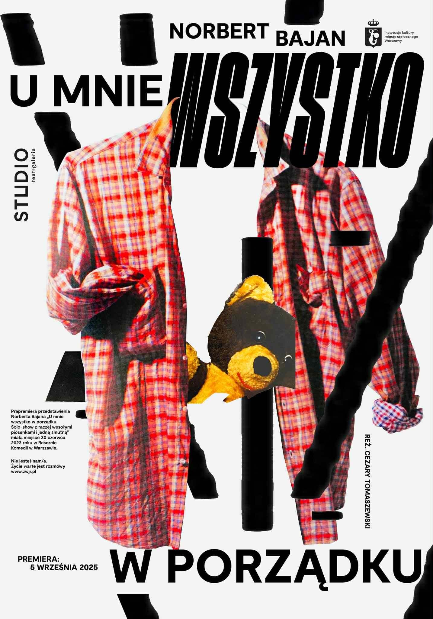 Cezary Tomaszewski wraca na scenę, by opowiedzieć o swoim partnerze – tragicznie zmarłym Norbercie Bajanie – i podjąć próbę rekonstrukcji jego solowego show łącząc proces żałoby z refleksją nad społeczną odpowiedzialnością za zdrowie psychiczne. Spektakl Norberta, zatytułowany „U mnie wszystko w porządku. Solo-show z raczej wesołymi piosenkami i jedną smutną” (prapremiera: 30 czerwca 2023, Resort Komedii w Warszawie), był pełen lekkości i humoru. Dziś – po jego śmierci – ten sam tytuł niesie w sobie bolesną ironię i trudne pytania. Pod warstwą śmiechu i piosenek ukrywały się zmagania, o których Norbert mówił nie wprost – ale mówił. Dziś jego głos wybrzmiewa ponownie w procesie twórczym zespołu pracującego nad spektaklem. Pokazy: 6, 7, 13, 14, 21 września 2025. Spektakl bierze udział w dziewiątej edycji Generation After 9. Showcase, organizowanego przez Nowy Teatr w dniach 4–6 września 2025 roku.