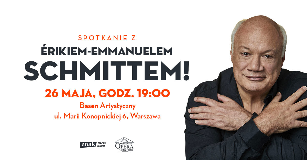 Éric-Emmanuel Schmitt, wielka gwiazda literatury francuskiej, spotka się czytelnikami w Warszawie już w poniedziałek 26 maja o godz. 19:00. Pisarza i czytelników ugości Warszawska Opera Kameralna w przestrzeniach Basenu Artystycznego na ul. Konopnickiej 6.
