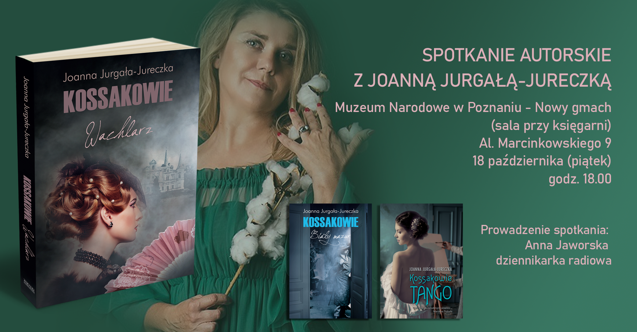 Z wielką przyjemnością chcielibyśmy zaprosić Państwa na poznańskie spotkanie autorskie z Joanną Jurgałą - Jureczką - wielką miłośniczką i znawczynią rodu Kossaków. Pisarka ma w swoim dorobku już kilka książek, w których opowiada nam o tej słynnej rodzinie, jak choćby "Kossakowie. Biały mazur" i "Kossakowie. Tango", natomiast podczas zapowiadanego spotkania skupimy się na najnowszej pozycji - "Kossakowie. Wachlarz".