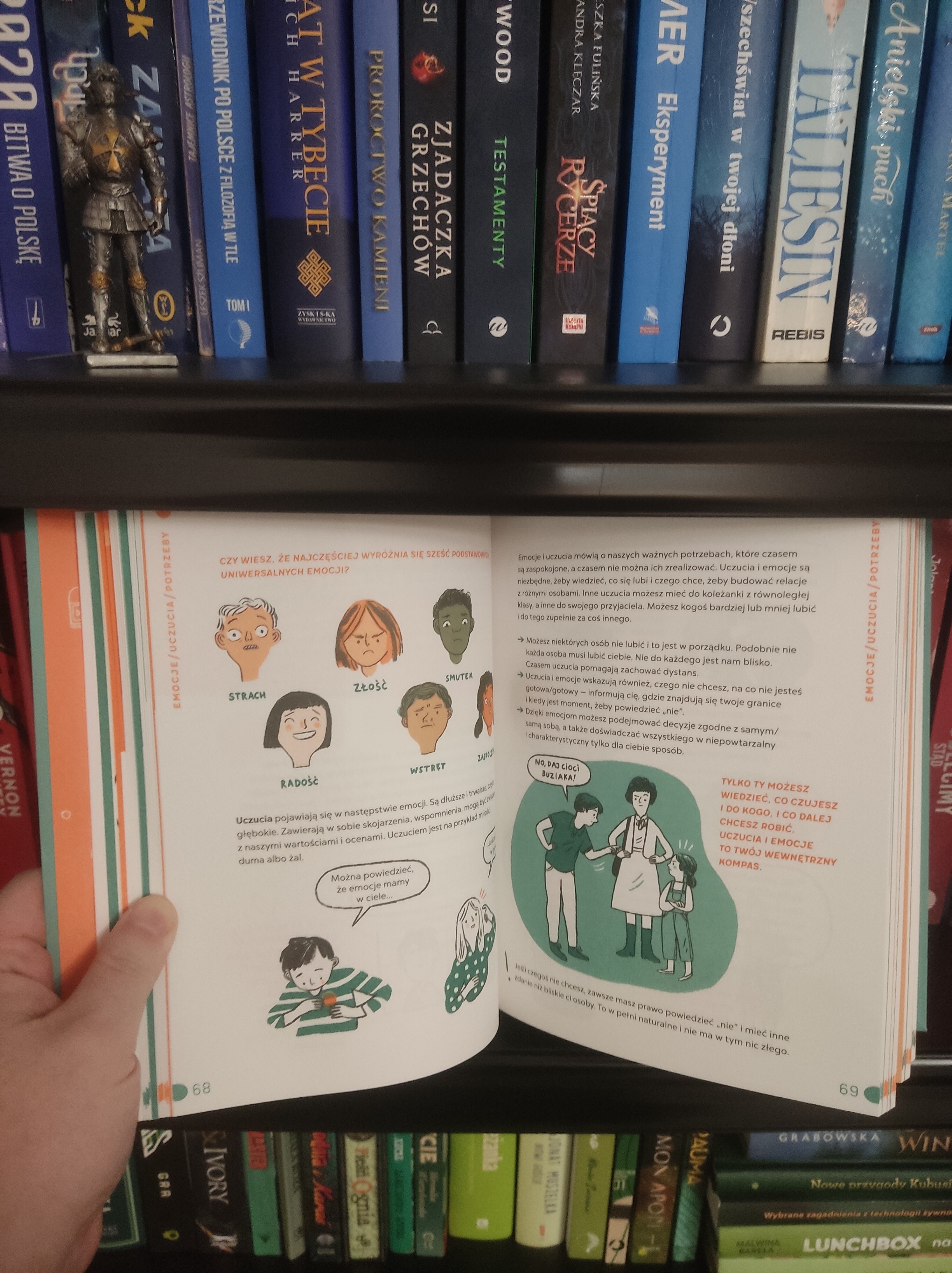 Niezwykle ważny element tej książki jest także opowieść o relacjach i emocjach oraz związanej z nimi poczuciu własnej tożsamości. To temat niezwykle trudny i bardzo często pomijany czy nawet piętnowany w szkole, w rodzinie i grupach rówieśniczych. Emocje dojrzewających młodych ludzi potrafią być niezwykle burzliwe i prowadzić do dramatycznych w skutki wybuchów. Autorka zatem cierpliwie opowiada na czym polega odkrywanie własnej tożsamości w początkowej fazie poznawania siebie. Jak należy kształtować relacje wynikające z emocji, uczuć i potrzeb. Że złość wcale nie musi być objawem zła, ale jednocześnie wyjaśnia jak postawić granice złości i agresji. Tłumaczy przy tym na czym polega koleżeństwo i przyjaźń oraz jak te relacje będą oddziaływać na wzajemność i równowagę w życiu młodych ludzi. Zaznacza, że współzawodnictwo i porównywanie się z innymi może wywoływać presję i powodować powstawanie niekorzystnych stereotypów.