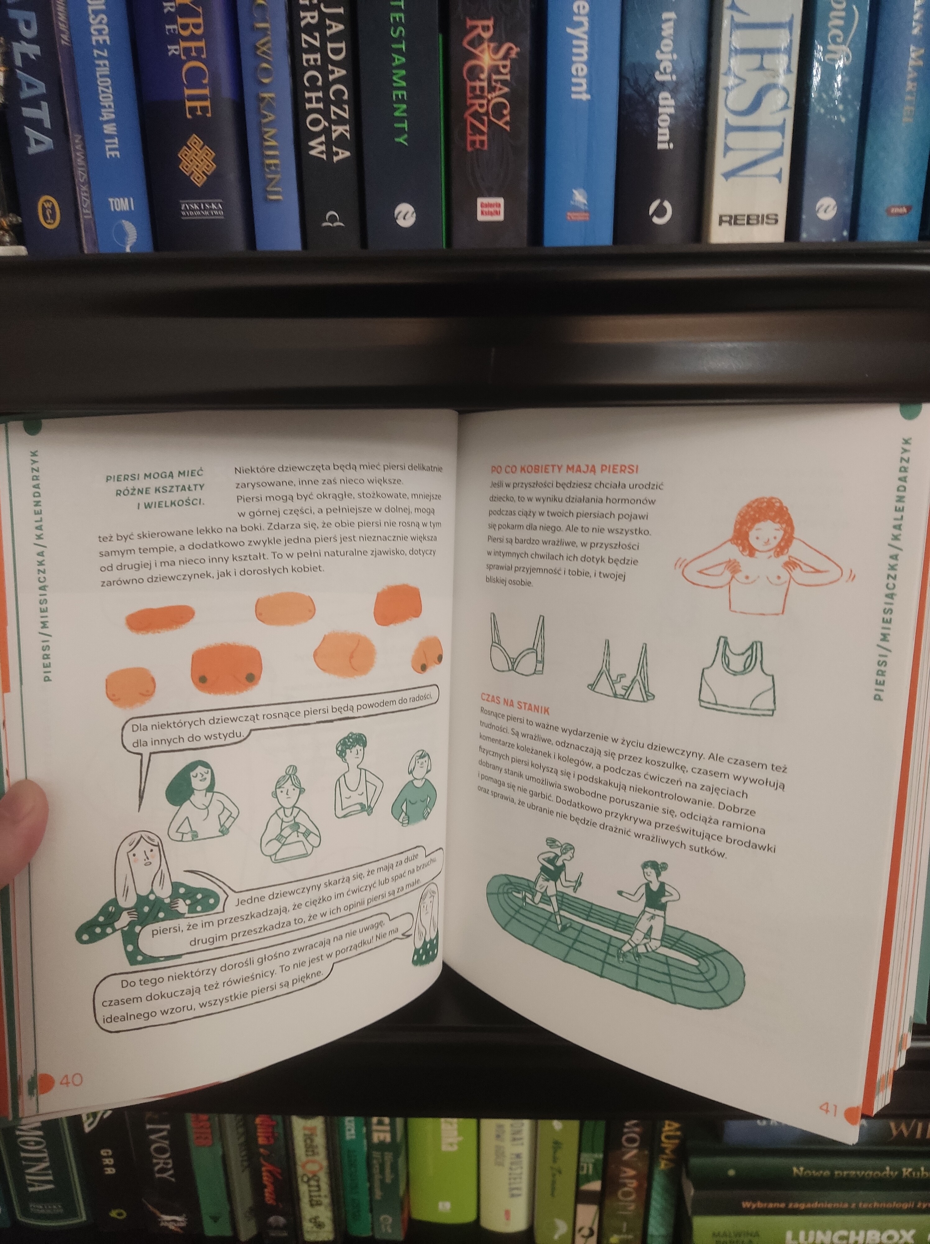Autorka nie boi się używania takich określeń, jak namiot, polucje, miesiączka, kalendarzyk, cipka czy penis. Rzeczowo przeprowadza młodego czytelnika przez zagadnienia związane z gospodarką hormonalną, które zaczynają bądź już zachodzą w ich organizmach. I z czym się to wiąże. Odpowiada na pytania po co nam owłosienie w miejscach intymnych i dlaczego piersi się powiększają. Treść jest zawsze wzbogacona subtelnymi ilustracjami, które nie przywodzą na myśl tych zawstydzających rycinek z podręcznika do biologii.